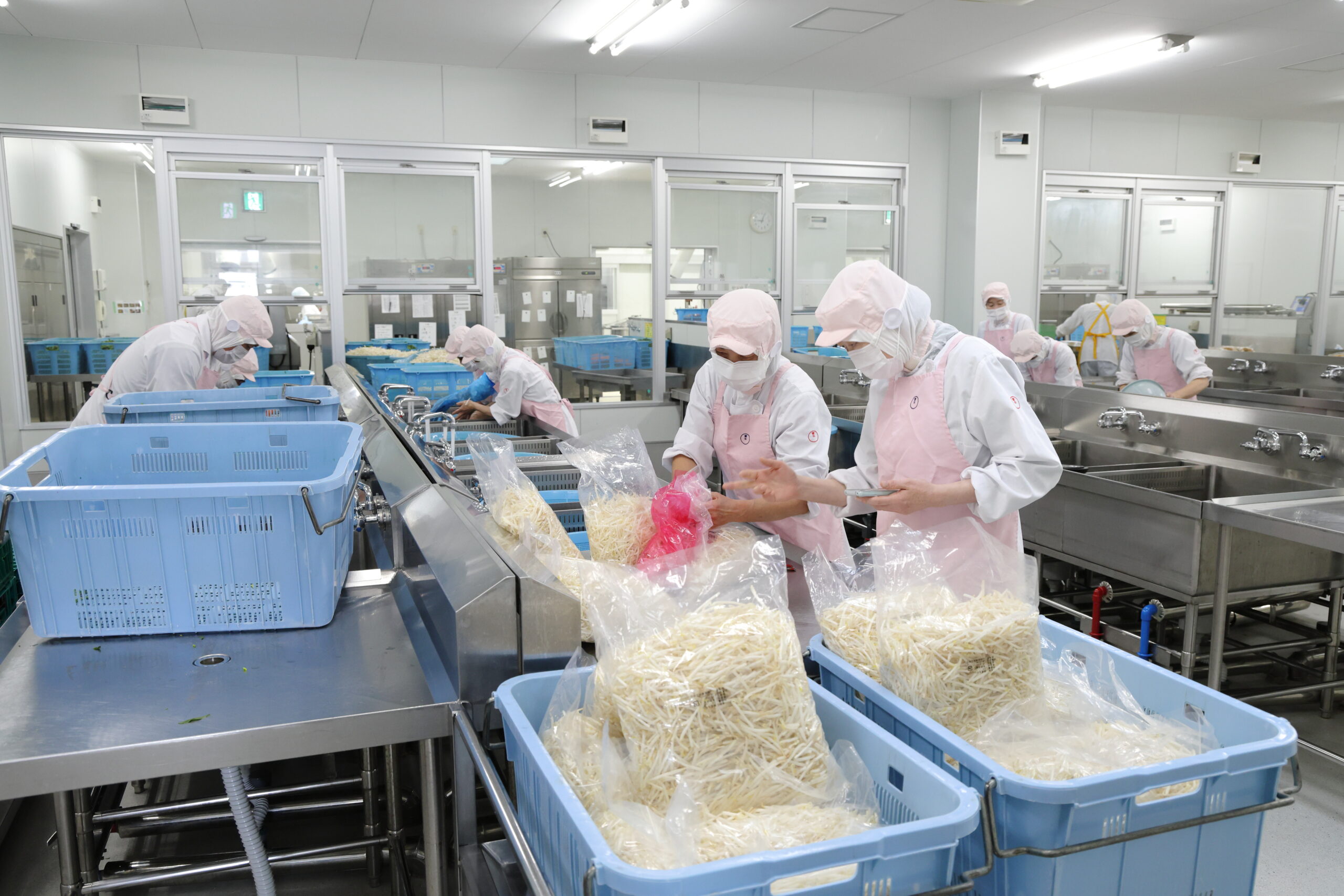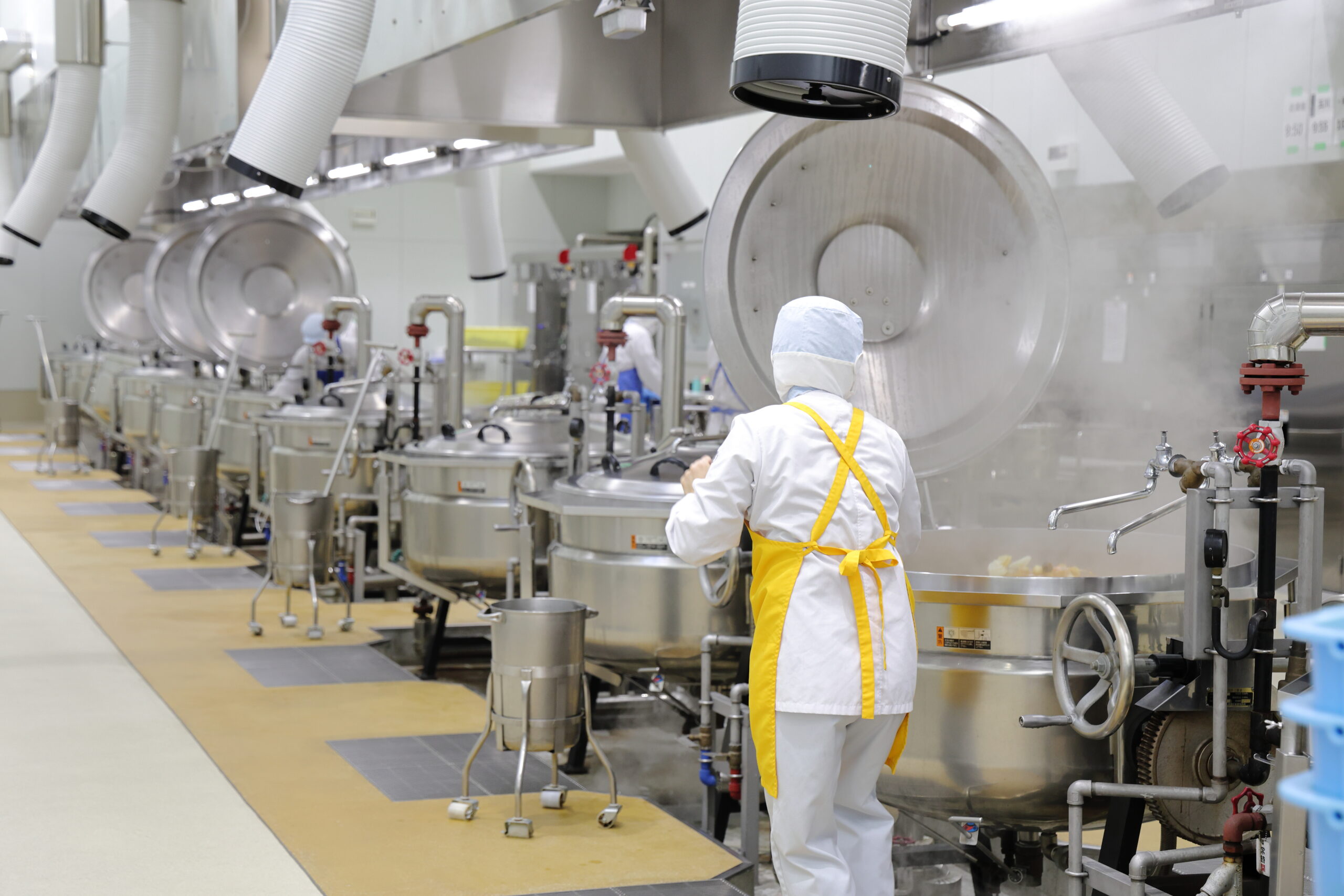 草津市給食センターには自所炊飯やフルドライシステム導入など、高い能力を有する大型の専用機器が数多く配置されている他、異物混入や様々な事故を未然に防止するため、入室にあたっては専用の作業着の着衣、手洗い、うがいに加えて、エアシャワー室通過も義務づけています。また、業務中に交差汚染を発生させないよう、厨房内は調理工程ごとに部屋が区分けされており、担当区域外の従業員同士の接触を制限、さらに真夏でも館内が高温多湿とならないよう大型のエアコンも完備され、衛生環境の保持にも万全を尽くしております。