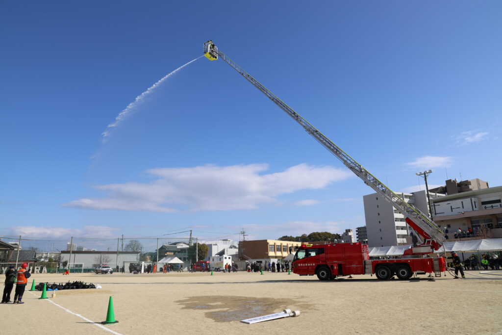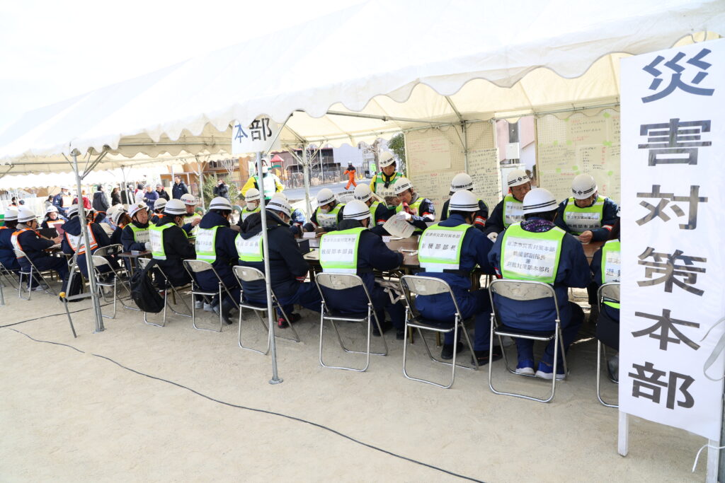 今回は、「大雨の中、 南海トラフ巨大地震が発生し、草津市で震度6強を観測した」という設定で訓練を開始。地震発生時に身を守る行動訓練(シェイクアウ訓練)から始まり、安否確認や情報伝達、避難行動などの住民参加型訓練が行われました。同時に避難対策や避難所運営、災害対策本部の運営といった支援する側の訓練も実施。さらに移動式トイレの展示や消防車のはしご車による放水訓練、防災ヘリコプターの飛来など、災害時の対応を学べるさまざまな企画が実施されました。
