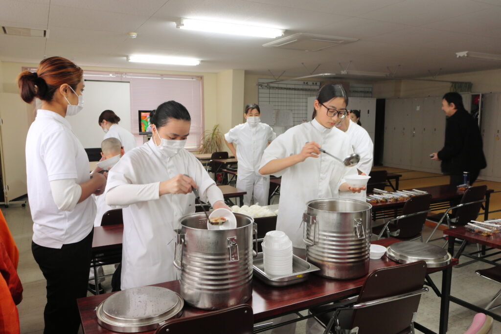 キッチンカー設営後の調理では、お米の炊飯に加え、山形の郷土料理である芋煮を約100人分を調理。副菜には、当社独自の完調品「ケアフィー」から切り干し大根、ひじき、肉団子を使用し、あわせて常食をミキサー食へ加工する練習も行い、災害時でも多様なニーズに応えることの大切さも学ぶ機会となりました。
