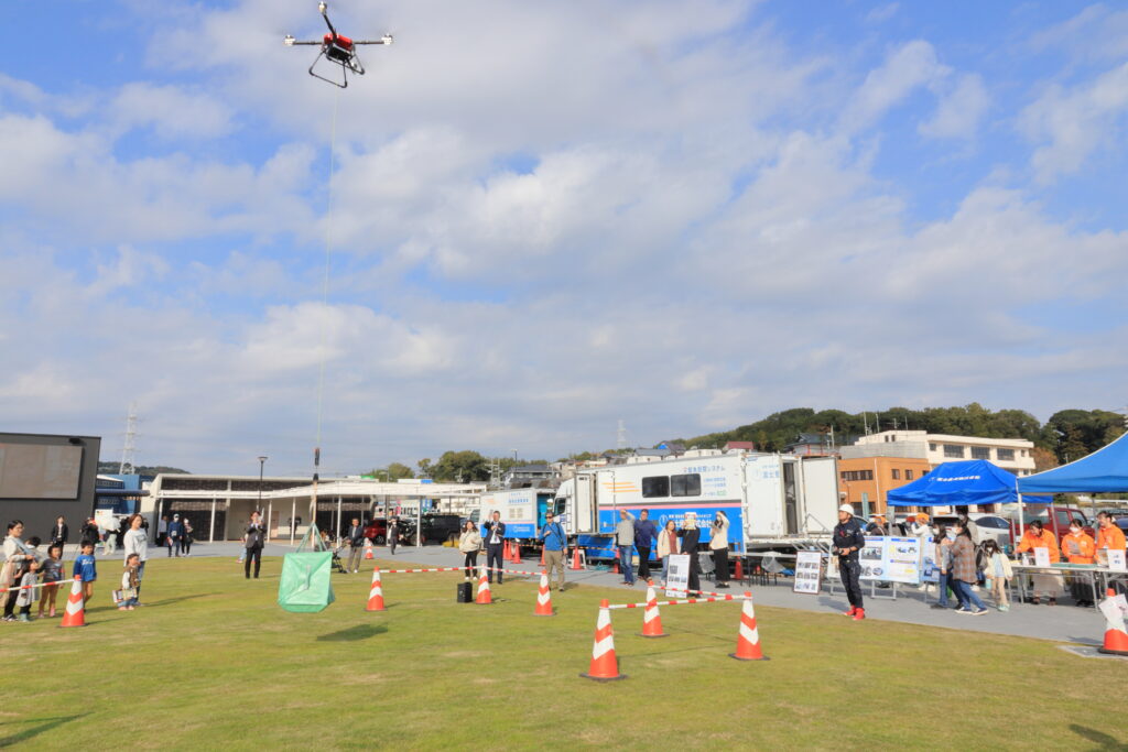 食料運搬への活用を目指しているドローンの飛行デモンストレーションを3回実施しました。災害時の新たな支援手段として注目を集め多くの来場者が足を止めて見学するなど、高い関心が寄せられました。