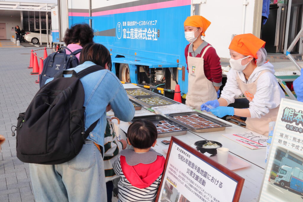 また、過去に災害支援を行った熊本地震の様子や、能登地震の現場での活動について、パネル展示を通じて紹介。多くの方に興味を持っていただき、実際の支援現場の写真や取り組みを通して、食事支援の重要性についてお伝えました。